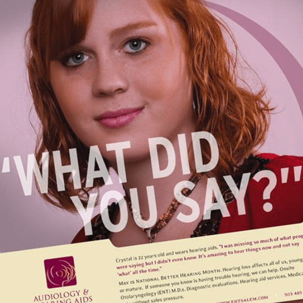Willamette Ear, Nose, Throat and Facial Plastic Surgery (WENT) wanted to promote its audiology and hearing aid practice. Conventionally, audiology clinics market strictly to older clientele. After doing research on when interest in hearing aids begins (30 to 40 years of age) and who makes healthcare decisions in the household (young to middle-aged female household “caretakers”), BMG suggested creating an ad campaign directed at a younger audience. The campaign featured full, glossy ads of real patients who didn’t fit the hearing aid stereotype. Hearing aid sales increased significantly despite an economic recession.